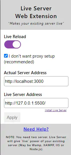Na outra opção da extensão, de nome "Actual Server Address", vamos colocar o endereço que o nosso PHP irá rodar, normalmente utilizamos http://localhost:3000 e logo depois clique em Apply.