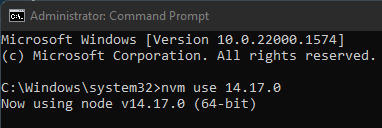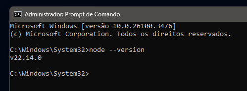 Lembre-se de que, nos pré-requisitos, anotamos a versão do Node. Agora, vamos utilizá-la digitando o seguinte comando no prompt de comando para instalar o Node. No nosso exemplo, a versão era 22.14.0, então usaremos essa.