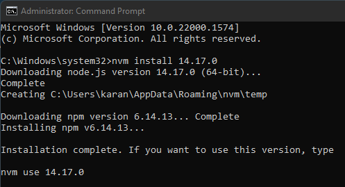 Se a instalação for bem-sucedida, você verá um número de versão. Caso contrário, aparecerá a mensagem node is not recognized as internal command.