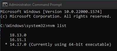 Um comando útil é o nvm list, que exibirá todas as versões do Node instaladas na sua máquina. Ele também indicará qual versão está sendo utilizada atualmente, mostrando um 🞷 na frente do número da versão.